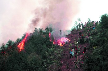 昨日上午9時(shí)許,大風(fēng)讓火勢(shì)再次蔓延。此時(shí),600多名增援的武警、消防戰(zhàn)士、民兵預(yù)備役戰(zhàn)士迅速投入到山火的撲救之中。寬25米、長(zhǎng)1公里的隔離帶剛剛砍伐成功,迅猛的火勢(shì)立即就蔓延過(guò)來(lái)。到上午11時(shí),4條隔離帶相繼失守。常規(guī)的山火撲救方法已經(jīng)無(wú)法奏效,只得重新布置兵力。20米的隔離帶被拓寬到了25米,三組人員同時(shí)展開(kāi)戰(zhàn)斗。記者在現(xiàn)場(chǎng)看到,附近許多村民已將自家的電視機(jī)、桌子、衣被等物什全部搬至空曠地。