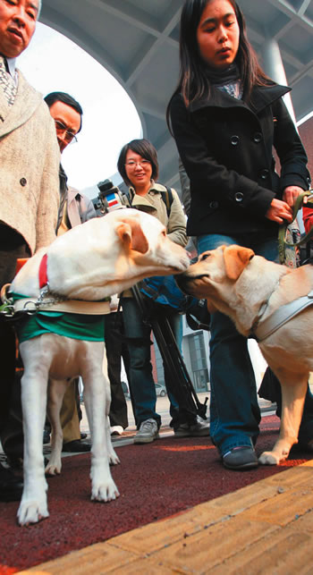 相比日本的導(dǎo)盲犬,正在訓(xùn)練中的中國導(dǎo)盲犬毫不示弱,它們也能跟隨馴導(dǎo)師的英文指令作出相應(yīng)的反應(yīng),比如說一聲“go”,聽話的拉布拉多犬就會帶領(lǐng)主人前行。上海市殘聯(lián)的有關(guān)人士告訴記者,今年3月起上海正式啟動了導(dǎo)盲犬的訓(xùn)練培育項目,其中14條分批送往上海的家庭寄養(yǎng),還有4條作為探索犬放在南京訓(xùn)練,這次前來的導(dǎo)盲犬就是正在南京“集訓(xùn)”的“精英”。