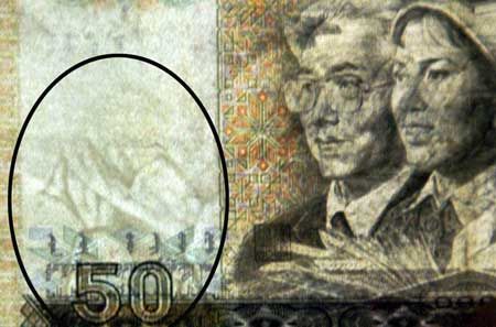 后經(jīng)記者仔細辨認,發(fā)現(xiàn)這張編號為GS8790902的1990年版的50元人民幣和其他同版本同面值的一樣,正面都是工人、農(nóng)民和知識分子頭像,背面是黃河的壺口瀑布,不同的是正面毛主席像水印頭像卻呈倒立狀,并且位置比正常錢幣偏上。這張錢幣的水印和正常錢幣的差異如此之大,難道是張假幣?可是朱燦祥卻告訴記者,他的這張鈔票無論在哪家銀行驗鈔,都會出現(xiàn)同一個結(jié)果:是張真幣。