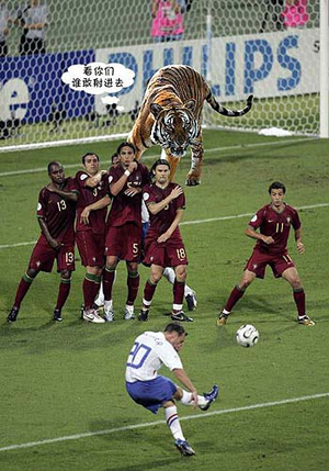一些網友還為華南虎賦予“靈性”,讓它參與了激烈的足球賽,甚至做起了“門衛(wèi)”。在球賽版的PS照片中,華南虎成為了守門員,正“虎視眈眈”地盯著“對手”,甚至還威脅“看你們誰敢射進門”(網友設計臺詞),那場景讓人忍俊不禁。
