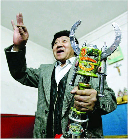 看看這東西,您知道它是干什么用的嗎?這是一件“武器”,是鄭州市民78歲老漢胡國平的新“發(fā)明”,他說,這件“武器”威力可不小,它集10種功能于一身,可分上下左右前后多方位攻擊敵人,也能釋放辣椒水噴射敵眼,可攻可守,如能推廣,將是民警與巡防隊(duì)員制敵防身的有力武器。