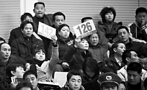 這是地壇廟會(huì)拍賣的現(xiàn)場,100多名商戶正爭奪明年春節(jié)廟會(huì)的45個(gè)飲食攤位。