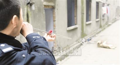 無奈之下,警察們只好分頭堵截,采取迂回靠近方法。半個多小時后,終于將這條流浪狗堵在小巷內(nèi)!昂脵C會!”賈世釗不慌不忙地將麻醉針管裝入不銹鋼空心管中,在5米開外對準(zhǔn)白狗輕輕一吹。只見麻醉針管在空中劃出一條曲線,擊中流浪狗脊背,但遺憾的是針管歪向了一邊。受驚后的白狗企圖逃跑,賈警官立即吹出了第二針,這下針管穩(wěn)穩(wěn)地扎進了白狗背部。一秒,兩秒……幾秒鐘后,白狗開始搖晃,接著便軟軟癱倒在地。