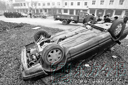 殷廣濤向記者解釋了警方的說法:執(zhí)勤民警當時接到命令,堵截一輛深藍色的桑塔納轎車?吹皆41236后進行攔截,但此車根本沒停,民警遂進行追截。在離轎車500米遠的地方,轎車為躲避一輛電動車猛打方向盤,導致自己翻倒。