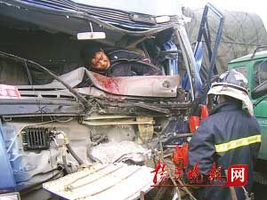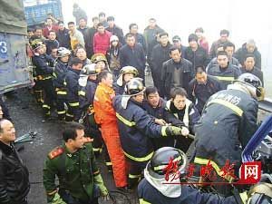 情況緊急,交警迅速調(diào)來清障車,將前面一輛卡車吊離;在騰出足夠的空間后,消防隊員馬上用機動鏈鋸,在變形的車頭上鋸開一道口子,再用擴張器進行擴張。但由于車頭變形嚴重,擴張器“使不上勁”,破拆進行得異常緩慢,而此時受困司機的呻吟越來越微弱!安蝗缦瞪侠K子將鋼板拉翻”,現(xiàn)場一位群眾建議。消防隊員忙找來纜繩,纜繩的一頭拴在卡住司機身體的鋼板上,另一頭剛垂了下來,很多現(xiàn)場的群眾就趕忙走上前來和十多名消防隊員一起抓住了繩子,一齊使勁后鋼板卻沒有絲毫松動。力量不夠!見此情景,旁觀的其他群眾馬上也加入到了拉繩子的行列中來,很多群眾都光著手死死地拽著鋼繩,“一、二、三”,壓在司機身上的鋼板終于被掀翻,司機得救了,現(xiàn)場一片歡呼聲。但躺在駕駛位后面的另一位男子已不治身亡。受傷司機介紹,事發(fā)時,當?shù)赝蝗怀霈F(xiàn)了濃霧,視線受阻,前方卡車突然剎車后,他就一頭撞了上去。 (水梅 路遙 宏偉 王國柱)