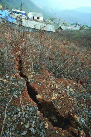 昨日下午,由于救援現(xiàn)場(chǎng)被三重封鎖,記者再次繞道爬上陽(yáng)沖鐵礦的北面后山,在距離鐵礦礦井口約20米遠(yuǎn)處,一條長(zhǎng)達(dá)十余米的裂縫驚現(xiàn)眼前,而裂縫所在的位置的下方,正是該礦的采礦區(qū)域。這條裂縫有近20厘米寬,形成一片面積約50平米的扇形塌陷區(qū),塌陷區(qū)內(nèi)還有多條細(xì)一點(diǎn)的裂縫。