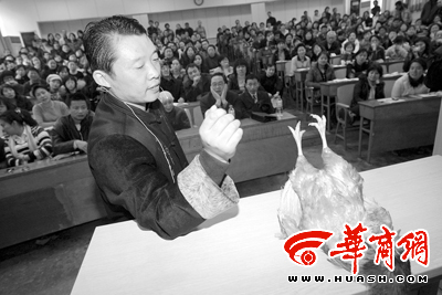 而最令大家感興趣的還是對(duì)一只母雞的催眠。這只剛剛從市場(chǎng)上買(mǎi)來(lái)的母雞一進(jìn)會(huì)場(chǎng),就拍著翅膀,想從徐毅強(qiáng)手中掙脫。不過(guò),伴著徐毅強(qiáng)“別緊張、放松”的話語(yǔ)和輕柔的撫摸,慢慢的,這只母雞乖乖地躺在了桌面上,一動(dòng)不動(dòng),看上去很安靜!捌鋵(shí)催眠并不神秘,我們經(jīng)?梢钥吹,在明星演唱會(huì)上,粉絲會(huì)在偶像的帶動(dòng)和引導(dǎo)下,作出揮手或吶喊等反應(yīng),這時(shí)候可以說(shuō)他們也被偶像催眠了!钡谒能娽t(yī)大學(xué)心理教研室副教授肖瑋用了非常通俗的一個(gè)比喻,解釋了人為什么會(huì)被催眠。