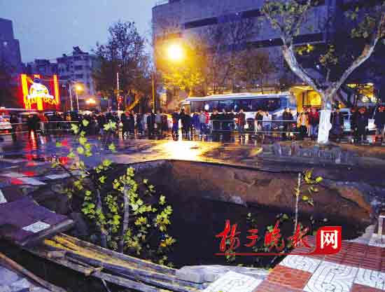 由于路面塌陷,暴露在坑口部位的煤氣管道和水管處于懸空狀態(tài),已經(jīng)“彎了腰”,為防管道扭曲引發(fā)斷裂,甚至再出現(xiàn)二次事故,地鐵施工方立即組織人員用鋼筋支撐管道。很快,一輛翻斗車(chē)運(yùn)來(lái)一斗沙包,幾十名工人將近百袋沙包填了進(jìn)去,但坑內(nèi)竟聽(tīng)不到聲音,好像“無(wú)底洞”。為了安全,幾十名工人被緊急撤出現(xiàn)場(chǎng)。大坑南側(cè)兩米遠(yuǎn)的綠化島上有一棵成年大梧桐,記者設(shè)法接近洞口進(jìn)行拍照,于是來(lái)到那棵大樹(shù)下,料想靠著它是安全的。剛拍完一張照片后,兩名救援人員立即攆走記者。5點(diǎn)49分,“轟”的一聲響,現(xiàn)場(chǎng)跟著傳出一陣驚訝聲,記者原先依靠著拍照的那棵樹(shù)掉了下去,綠化島也塌陷了一段,驚得記者出了一身冷汗:乖乖,若剛才遲走片刻,后果難料!此時(shí),現(xiàn)場(chǎng)的警察和保安嚴(yán)厲疏散圍觀人員,警戒線又隨著擴(kuò)大了一圈。6點(diǎn)11分,又是一聲轟響,大坑西側(cè)的一棵樹(shù)也塌陷進(jìn)坑,樹(shù)旁的一對(duì)垃圾桶也不見(jiàn)。此時(shí),警戒線又大了一圈,記者很快從交管部門(mén)獲悉,漢中路東向西實(shí)行全封閉,公交車(chē)、私家車(chē)全部從周邊上海路、牌樓巷等處繞行,西向東只剩下兩股車(chē)道,何時(shí)恢復(fù)要看搶修進(jìn)度。