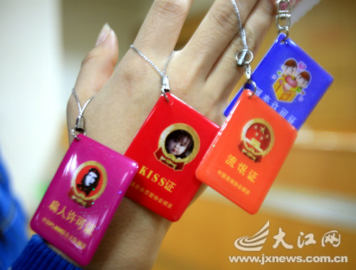 證件,人們?nèi)粘I钪凶钇匠R沧畈豢苫蛉钡挠闷,如今被網(wǎng)絡(luò)惡搞之風(fēng)席卷:“戀愛證”、“帥哥證”、“結(jié)婚證”、“處女證”等令人啼笑皆非的“惡搞證件”層出不窮。很多學(xué)生將它們掛在手機、鑰匙或背包上,將之視為一種新的校園時尚元素。記者發(fā)現(xiàn),被惡搞的紅色“結(jié)婚證”與真正的結(jié)婚證很相似,內(nèi)頁可以填寫兩個人的姓名,只是封面上印著“中國婚姻聯(lián)盟頒發(fā)”字樣。在“光棍證”、“流氓證”等證件中,同樣有大量的惡搞內(nèi)容,有些十分低俗。懷揣著“流氓證”的南昌市某小學(xué)三年級學(xué)生萬兵(化名)稚氣未脫地對記者說:“我是流氓我怕誰,拿著它多帥!”