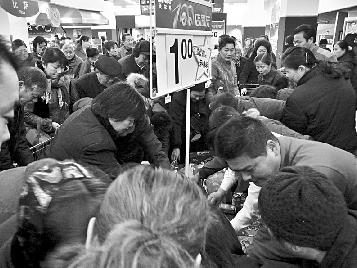 昨天上午8時30分,沃爾瑪洛陽市景華路店開門迎賓,在地下一層大賣場,1元可樂和雪碧成為前來購物市民的首選。老人們蜂擁而上(如圖)。雖然標(biāo)牌上寫著“每人限購5聽”,但不少老人只顧彎腰往懷里揣,全不顧被踩踏的危險。(記者 楊非)