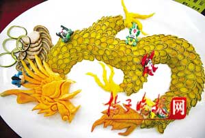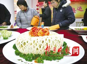 走進(jìn)展廳,記者就被展臺(tái)上的菜肴所吸引。在比“雕工”的展區(qū),南瓜、蘿卜、山芋等普通蔬菜被廚師們用妙手雕刻成龍、鳳、仙子等各色造型,刻工精細(xì),龍須、鳳尾上的羽毛,甚至是一根根的。已有10年廚齡的宋師傅告訴記者,作品里除了南瓜、還有紅、青蘿卜、山芋等食材,一共刻了三個(gè)小時(shí)才完工。在比“擺盤”的展區(qū),不少菜肴都是以奧運(yùn)為主題,用面條搭建的“鳥巢”體育場(chǎng),形象逼真。用白色白玉糕、綠色麥香糕、糯米元宵擺出的五環(huán)體育場(chǎng)惟妙惟肖,“操場(chǎng)”外五位用糯米做的福娃更是可愛喜人,據(jù)介紹,從蒸糕點(diǎn)到擺盤,廚師一共花了九小時(shí)呢,香噴噴的米糕看著都眼饞。