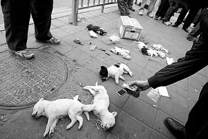 昨日上午10時50分許,在豐臺太平橋城管分隊執(zhí)法過程中,六里橋南一處地攤十余只待售貓狗等小動物遭故意摔踩斃命。城管隊員稱是攤主對抗執(zhí)法故意殺死動物,附近無照攤販們稱虐殺小動物是城管所為。事發(fā)后,一度有近300名群眾圍觀表達不滿,中國小動物保護協(xié)會會長蘆荻前往豐臺城管大隊了解事實真相。
