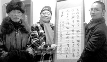 昨日下午,記者來到兩位老人家里,見老人們的兒女?dāng)v扶著兩位老人,拿出了跟隨他們夫妻60余年的郭老真跡。四川省博物館副館長魏學(xué)峰接過捐贈的書法后,向老人頒發(fā)了《文物征集獎勵證書》,并表示感謝。
