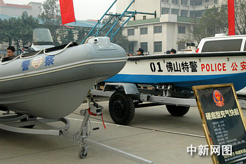 記者在演練現(xiàn)場看到,醒目的標語飄蕩在廣東省佛山市人民警察學(xué)校上空,裝備展示區(qū)內(nèi),具最新科技水平的裝甲車、突擊車、沖鋒舟、機器人一應(yīng)俱全,各種警備器械令人目不暇接,“科技強警”在佛山成效顯著。
