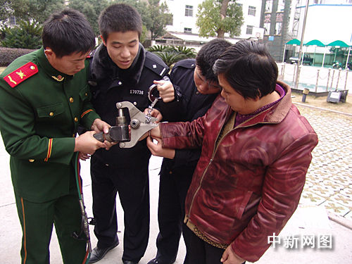 中新網(wǎng)溫嶺12月28日電(記者 柴燕菲 通訊員 陶文波 彭軍偉) 12月27日下午,溫嶺市新河派出所的民警帶著一位中年婦女來到溫嶺消防大隊(duì)救助,原來該中年婦女的右手腕被手拷牢牢拷住,民警用鑰匙以及其它方法嘗試都無法打開。最后,在大家齊心協(xié)力的幫助下,巧妙的利用手動(dòng)液壓剪、鉗子等方法成功解救出了手腕。