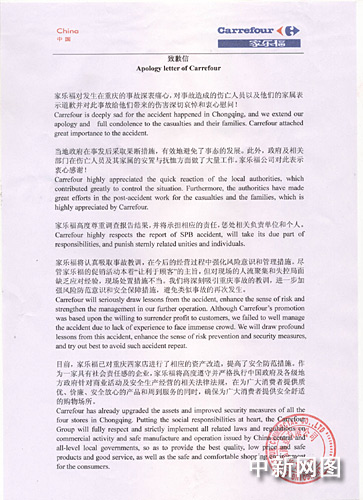 今天,家樂福方面公開了一份致歉信,信中說,“家樂福對發(fā)生在重慶的事故深表痛心,對事故造成的傷亡人員以及他們的家屬表示道歉并對此事故和給他們帶來的傷害深切哀悼和衷心慰問!”