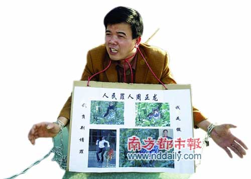 空曠的廣場顯得這個特殊打扮的人特別惹眼。昨天下午3點左右,深圳市民中心廣場南面邊緣正對國旗的位置,這名男子安然盤腿而坐。他胸前掛著一個紙殼做的大牌子,上面貼著4張網(wǎng)上惡搞華南虎的照片。照片周圍是毛筆黑字,上聯(lián):我是假老虎,下聯(lián):我負荊請罪,橫批:人民罪人周正龍。