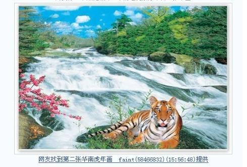 2、2007年11月15日晚九時(shí)許,網(wǎng)友"攀枝花xydz"在色影無忌華南虎臨時(shí)論壇里發(fā)帖稱:"老虎是假的。我今天仔細(xì)看我家的一副掛在墻上的老虎畫,除了耳朵不一樣,哪里都是一樣的,連老虎的紋路都是一樣的。但我不知道怎么傳圖,我已經(jīng)照下來了。"