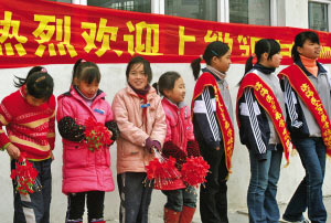 下午2時50分,捐贈單位代表在學生“熱烈歡迎”聲中來到學校。幾位代表發(fā)言后,他們逐個班級向?qū)W生們贈送書包、詞典、筆記本等文具。其中一名代表告訴記者:“本來說好2點鐘來的,后來開會耽誤了。”