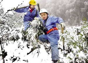 渝東南連續(xù)3日普降大雪,武隆仙女山等地積雪超過10厘米,部分電力設(shè)施出現(xiàn)覆冰現(xiàn)象。一旦冰塊增多,輸電線的電阻增加減少輸電能力,電線還容易下垂斷裂。一旦斷裂,不僅這些區(qū)縣將出現(xiàn)大面積停電,進出主城的電力也會受到影響。為了保證電力的正常供應(yīng),一支24人的“打冰隊”每天都在巡查打冰。