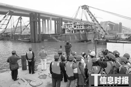 據(jù)現(xiàn)場指揮人員介紹,被拖往擔(dān)擔(dān)沙島后,還要用鋼絲繩對船體進(jìn)行固定,防止船體移動影響西江主航道通行,這需要大約兩個小時,“盡量在天黑前完成所有工作!睋(jù)悉,“南桂機(jī)035”全長75米,撞塌九江大橋后,其頭部15米已栽入河床,被900噸的斷橋殘骸壓著,船頭今后將與河床清理同時進(jìn)行。