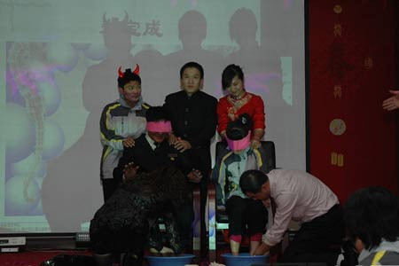 網(wǎng)友在帖子中描述說(shuō),幾日前的一個(gè)下午,自己在北辰企業(yè)的表彰會(huì)上經(jīng)歷了一場(chǎng)感人場(chǎng)面,在文藝演出告一段落、主持人宣布表獎(jiǎng)名單后,公司的兩位經(jīng)理上臺(tái)為兩位獲獎(jiǎng)員工頒獎(jiǎng),獎(jiǎng)品是華東五市游和一套豪華床上用品,讓所有嘉賓沒(méi)想到的是,主持人神秘地令兩人坐在幕簾后面,感動(dòng)在場(chǎng)所有人的一幕發(fā)生了:兩位公司經(jīng)理正跪著為朦住雙眼的兩位員工洗腳。
