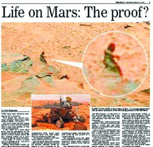 這張令人驚訝的火星照片顯示,在紅色星球的一處山坡上,一個(gè)腦袋碩大、如同“大腳怪”的黑色身影正揮著手臂走下火星山坡,它看起來(lái)又像是正坐在一塊石頭上休憩,還有人稱,照片上的“火星人”看起來(lái)像是一名女性。針對(duì)這幅“火星人”照片,英國(guó)《每日郵報(bào)》幽默地評(píng)論說(shuō):“她坐在一塊巖石上,像在等一輛公共汽車,不過(guò)如果真是這樣的話,她可能得面臨永無(wú)止境的漫長(zhǎng)等待!薄短┪钍繄(bào)》則將這個(gè)“火星人”比喻成是藏得無(wú)影無(wú)蹤的本·拉丹:“它是一塊巖石,還是火星光線的錯(cuò)覺(jué)?或者是本·拉丹在遠(yuǎn)離地球3億英里遠(yuǎn)的荒蕪藏身處朝地球揮手?”