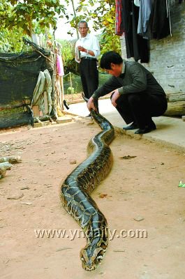 可最終,鄰居要走的7條小蟒蛇都先后死了,只有自己留下的兩條一直養(yǎng)到了兩公斤重。楊建松回憶說,當(dāng)時(shí)他在生產(chǎn)隊(duì)當(dāng)聯(lián)防隊(duì)員,每天除了下班后飼養(yǎng)兩條小蟒蛇外,上班時(shí)他也一直帶在身上,有空就拿出來玩耍。在1995年的一天,他帶著兩條已經(jīng)有50多厘米長的小蟒蛇出去玩時(shí),一個(gè)親戚看見他衣服口袋里裝著什么東西撐得鼓鼓的,就將手伸進(jìn)他的口袋想掏出來看個(gè)究竟。誰知伸進(jìn)口袋一抓,就抓住了口袋中的小蟒蛇,拿出來一看,嚇得驚慌失措的這位親戚慌忙一下子就將手中的小蟒蛇摔在地上,結(jié)果這條小蟒蛇當(dāng)場被摔死了。