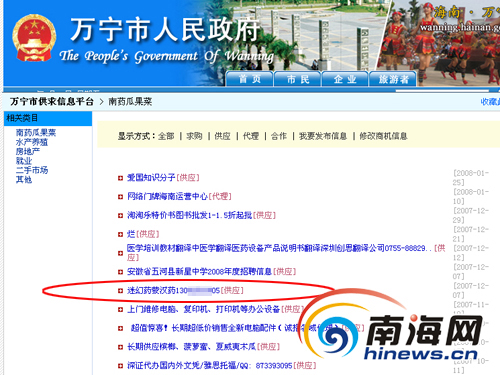 記者打開萬(wàn)寧市人民政府網(wǎng)站時(shí),在首頁(yè)上點(diǎn)擊進(jìn)入萬(wàn)寧信息供應(yīng)平臺(tái),在該平臺(tái)上的“南藥瓜果”欄目的第六條信息中,記者發(fā)現(xiàn)“迷幻藥蒙汗藥13082***905[供應(yīng)]”的信息。點(diǎn)擊進(jìn)入時(shí),里面的內(nèi)容非常詳細(xì)。不但介紹了香港GHB粉、香煙型迷藥、噴霧型迷藥等各類迷幻藥蒙汗藥的成分、價(jià)錢、服用方法,還標(biāo)明了服用后的反應(yīng)。該信息還稱,“誠(chéng)信交易,貨真價(jià)實(shí),無(wú)效退款。!嚴(yán)禁一切詐騙分子復(fù)制本公司廣告。!本公司本著信譽(yù)第一,效果保證,誠(chéng)信經(jīng)營(yíng)的原則,真誠(chéng)與全國(guó)各地朋友長(zhǎng)期合作,真正需要貨的朋友,請(qǐng)注意,提防騙子用低廉價(jià)格寄假貨,來(lái)騙取你們急需等著用貨的人,請(qǐng)不要貪小便宜而上當(dāng),效果那么好,能賣你兩三百元,四五百元嗎?我們的藥雖然比別人貴了點(diǎn),但效果絕對(duì)保證達(dá)到我們廣告所說那種效果,貨到你們當(dāng)?shù)啬阍囈幌,你就知道我們的藥效和信譽(yù)。本公司奉勸那些網(wǎng)絡(luò)騙子。不要再騙那些真的需要藥的朋友了,都是在外面混的人。少做點(diǎn)讓人罵的事。也勸沒有貨的商家,我這里有大量的貨可以批發(fā)給你們,你找不到進(jìn)貨渠道。可以在我這里拿,你要的量大。我們可以談。批發(fā)的價(jià)錢可以給你去賣,并且比你騙別人的那點(diǎn)錢,賺得多,誠(chéng)信經(jīng)營(yíng)生意越做越大,欺詐客戶生意越做越小。歡迎來(lái)電洽談合作!