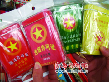 24日下午,記者在黃埔軍校舊址紀(jì)念館大聯(lián)盟商店的一攤紀(jì)念品中,赫然發(fā)現(xiàn)一只紅彤彤的“泡妞許可證”,拿起來方知是只鐵皮煙盒。除此之外,還有以國(guó)徽為背景的“中華人民共和國(guó)超級(jí)帥哥證明”、“泡哥許可證”、“靚女證書”、“土匪資格證”、“流氓合格證”、“光棍證”、“傻B證”等五花八門的煙盒。