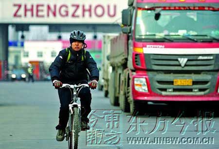昨日中午12時(shí)20分,鄭州北郊黃河大橋收費(fèi)站,當(dāng)一個(gè)戴著頭盔身背大包的小伙子騎著自行車(chē)駛出收費(fèi)站時(shí),早已在此等候的親朋好友發(fā)出一陣歡呼:高富松是全程騎著自行車(chē)從北京返回鄭州的,這么惡劣的天氣,這個(gè)從未受過(guò)相關(guān)訓(xùn)練的年輕人用了一周才走完。