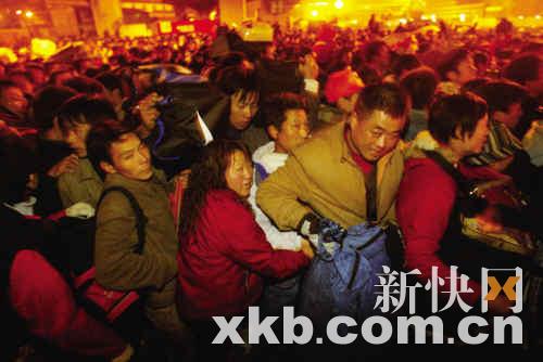昨日上午,近20萬乘客正在各段阻隔帶前翹首等待,不少人都試圖擠向最前面的入口,人疊人、肩靠肩、背貼背。記者看到,無數(shù)的頭不斷地涌向車站廣場東西入口。大批警察、武警為分薄人群,減少因擁擠造成的傷亡,與解放軍戰(zhàn)士圍成一條長達(dá)十幾米的人墻,嚴(yán)防人群過度擠壓。