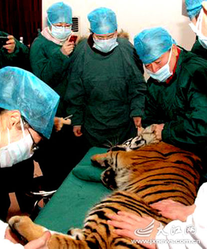 醫(yī)生先給關(guān)在特制鐵籠內(nèi)的小華南虎進行了預(yù)麻醉,讓其進入安靜狀態(tài)。華南虎被抬上了手術(shù)臺時,一個意外情況出現(xiàn)了,它的呼吸規(guī)律出現(xiàn)異常。老虎皮毛太厚,監(jiān)護儀根本感應(yīng)不了。醫(yī)生只好拿來聽診器聽老虎的心音,才慢慢捕捉到華南虎對麻醉藥物的反應(yīng)。借助聽診器,才緩緩給老虎注入麻醉藥物,直到其昏迷。