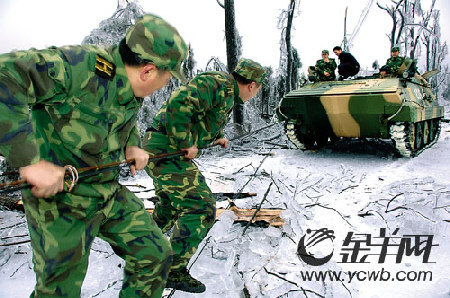 圖:廣州軍區(qū)某部緊急派出官兵和兩輛裝甲運(yùn)輸車以及推土機(jī)、大卡車等奔赴受災(zāi)山區(qū),一路上,領(lǐng)導(dǎo)帶頭揮舞榔頭、鐵鏟奮力破冰開路。