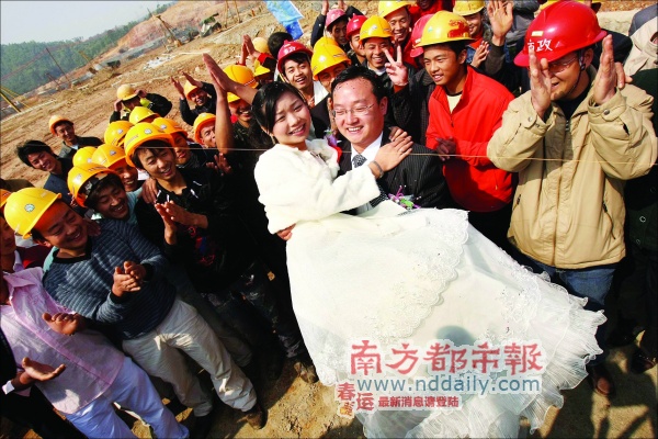因為大運會建設(shè)工程工期緊,這個春節(jié),來自深圳建筑工務署大運工程管理處的工程師高輝,昨日把原計劃在老家江西舉辦的終身大事,搬到了大運會的施工現(xiàn)場。而深圳市兩位副市長呂銳鋒、梁道行在工地上為一對新人做了證婚人。