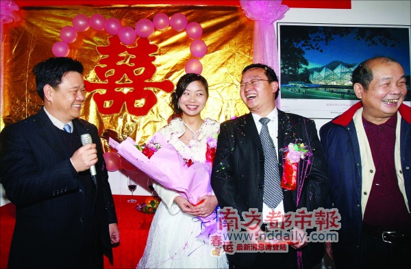 而得知這一消息后,昨日到施工工地慰問建設(shè)者們的呂銳鋒和梁道行兩位副市長,為新人們當了一回特殊的證婚人,除了給新人包上兩個大紅包,兩位副市長都祝愿新人愛情美滿,白頭偕老。