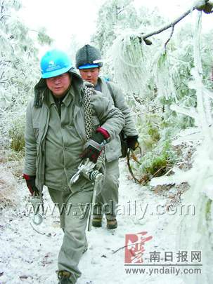 嚴重冰凍災害天氣讓曲靖很多地方的電網(wǎng)面臨嚴峻考驗。沾益縣的冰凍尤為嚴重,轄區(qū)電力設施損壞十分嚴重。在電力抗災搶險現(xiàn)場,記者看到厚厚的覆冰把電線壓塌,有些電桿被攔腰折斷。