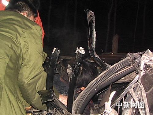 事故發(fā)生后,哈大高速公路交警大隊(duì)事故民警及安達(dá)消防大隊(duì)?wèi)?zhàn)士及時趕到現(xiàn)場勘察營救被困人員。救援人員趕到現(xiàn)場時看到,一輛大慶牌照的紅旗黑色出租車騎在路基與公路之間,車后座的一名傷者已經(jīng)從車內(nèi)爬了出來。駕駛棚頂被撞得嚴(yán)重變形,機(jī)器蓋破損嚴(yán)重,司機(jī)被困在駕駛室內(nèi),司機(jī)滿臉是血神志不清。消防戰(zhàn)士使用金屬切割機(jī)將駕駛員棚頂破拆開,將被困人員救出,兩名傷者被“120”送往醫(yī)院救治。