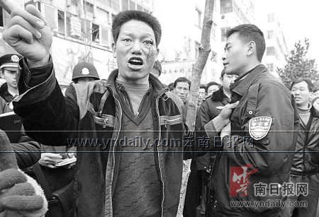 據(jù)李賢堂說,其家兄弟4人來昆明已有多年。二哥李賢友以前受過傷,醫(yī)治好后便身帶殘疾,與二嫂在昆明做米線生意。上午10點(diǎn)左右,他知道二哥送餌塊途經(jīng)人民東路時(shí)被城管打了,就迅速跑了來!翱吹蕉缣稍诘厣,餌塊散落一地,我就跑到一輛白色面包車前,攔住去路,沒想到,七八個(gè)男子就過來打我,他們那么多人,我咋個(gè)還手,打得我頭昏眼花,我只好抓住先打我的那個(gè)不放手!