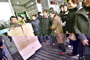 昨日中午1時許,兩名男子和一名婦女來到儲蓄所門前,高舉一個寫有“我在這里取到假錢”的紙牌子。舉牌子的男子叫汪登渝,長壽人,是進(jìn)城務(wù)工的農(nóng)民工!拔易蛱熘形缭谶@取了5000元準(zhǔn)備借給小舅子,半小時后我們走到家樂福后發(fā)現(xiàn)錢是假的。”汪說,當(dāng)時他在自動取款機(jī)上分三次取錢(前兩次各取2000元,第三次取1000元),點(diǎn)清數(shù)額后將現(xiàn)金和卡帶離儲蓄所,隨后來到家樂福買東西時發(fā)現(xiàn)異常,“我看到錢上的頭像是黃色的,就覺得有問題!蓖舻男【俗狱S先生說。不過,對于汪登渝半小時內(nèi)的行程,只有其小舅子能夠作證。