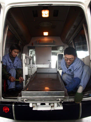 執(zhí)行區(qū)內(nèi)與洗手池相鄰,依次排著4個折疊彈簧坐椅。執(zhí)行區(qū)的中央擺著一張高0.8米、長1.8米的執(zhí)行床,床面是一層高強度鋁合金!败圀w后部以前是封閉的,現(xiàn)在改裝成了兩扇門!眱晌还と苏驹趫(zhí)行床兩側(cè)演示:把執(zhí)行床往車后一推,床下的支架立即折疊起來,執(zhí)行床沿著滑道伸出了后車門。離地面0.3米高時,一位工人從床下抽出了一根支架撐起,“被執(zhí)行人躺在上面后,就順著滑道再推回車內(nèi)。”
