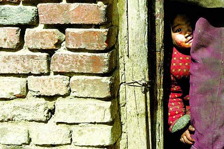 臟亂的床上,一個(gè)男嬰躺著睡覺。大點(diǎn)的孩子告訴記者,他叫“鵬鵬(音)”,他還會(huì)數(shù)數(shù),說起大弟弟的年齡,他伸出兩個(gè)指頭說,弟弟兩歲了。
