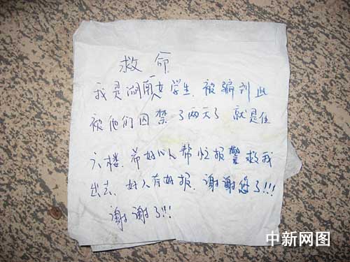 這天下午,一位熱心的中年婦女把發(fā)現(xiàn)字條的情況告訴了正在此地巡邏的民警,并把民警帶到樓下。民警見字條上面寫著“救命,我是湖南一女學(xué)生,被騙到此被他們囚禁了兩天了,就在六樓,希望好心人幫忙報(bào)警救我出去,好人有好報(bào)、謝謝您了。!”。