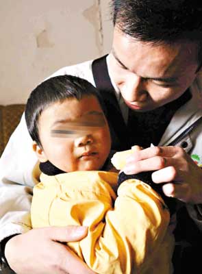 放好摩托車(chē)后,劉大毛便四處張望。當(dāng)他看到注視著他的記者一行時(shí),馬上拖起男孩子的手,笑嘻嘻地迎了上前。沒(méi)等仔仔介紹完隨行兩人的關(guān)系,女記者便已經(jīng)彎下身去逗小男孩?墒钱(dāng)她準(zhǔn)備抱他時(shí),孩子馬上大哭起來(lái),轉(zhuǎn)過(guò)身去,雙手緊緊地抱著劉大毛的右腿不放。在劉大毛的幫忙下,女記者才勉強(qiáng)抱起了男孩,但他依然哭個(gè)不停。