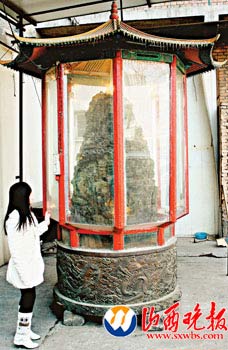 11日上午,在杏花嶺區(qū)五龍口街一個(gè)大院里,兩名參觀者仔細(xì)端詳著一塊巨大玉石,臉上露出驚奇的神情!斑@塊玉石真大、真漂亮,一定很值錢,可是怎么擺在院子里呢?”“它是塊緬甸玉,有4噸多重,我擔(dān)心擺放在樓房里,壓壞樓板,只好放在院中。”玉石主人劉學(xué)勤說(shuō)。