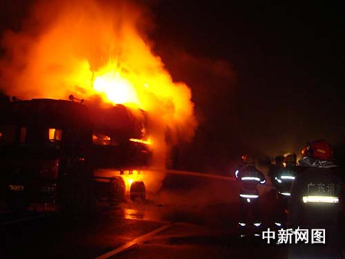 當(dāng)晚10點(diǎn)35分許,乳源消防中隊(duì)接到報(bào)警后,立即兩臺(tái)水罐消防車和13名消防官兵,與交警、路政等部門先后火速趕到現(xiàn)場(chǎng)進(jìn)行滅火。