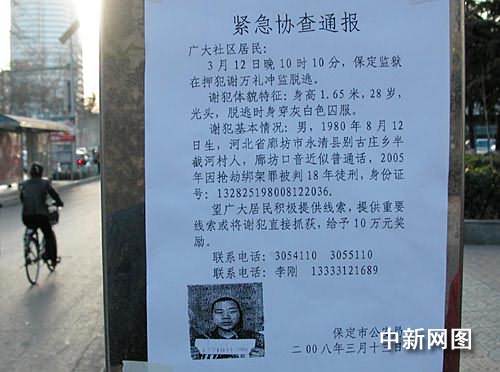 據(jù)悉,事件發(fā)生后,保定監(jiān)獄及當(dāng)?shù)毓、武警等部門出動(dòng)大批警力在周邊各個(gè)主要路口設(shè)卡布控,同時(shí)在市區(qū)街道、小區(qū)醒目位置張貼通告,全力通緝追捕越獄逃犯。(完)