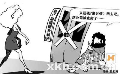 昨天下午,此前被媒體曝光騙取了多名想嫁洋老公的女子會(huì)費(fèi)的“無(wú)良婚介”廣州易廣聯(lián)婚姻咨詢(xún)公司,被廣州市工商局海珠分局等部門(mén)查封。據(jù)悉,根據(jù)《公司法》、《國(guó)務(wù)院辦公廳關(guān)于加強(qiáng)涉外婚姻介紹管理的通知》等條例的規(guī)定,易廣聯(lián)婚姻咨詢(xún)有限公司涉外婚姻介紹屬非法經(jīng)營(yíng),相關(guān)責(zé)任人將要受到刑事拘留。