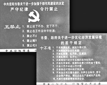 當(dāng)天大會(huì)上,《中共信陽(yáng)市委關(guān)于進(jìn)一步加強(qiáng)干部作風(fēng)建設(shè)的決定》和《中共信陽(yáng)市委信陽(yáng)市人民政府關(guān)于進(jìn)一步優(yōu)化經(jīng)濟(jì)發(fā)展環(huán)境的若干規(guī)定(試行)》兩份“紅頭文件”公布并開(kāi)始實(shí)施。