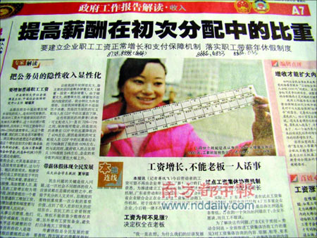這張個稅為0的工資條圖片源于3月6日廣州一家報紙。當時正值全國“兩會”,企業(yè)職工薪酬問題受到了人們的普遍關(guān)注,而且從今年3月份開始,個人所得稅的起征點由1600元調(diào)整到2000元。該報紙以“收入”為關(guān)鍵詞在A7版做了半個版的政府工作報告解讀,并特意采用了一張工資條的特寫照片作為插圖,而正是在這張圖里,工資所得者的個人所得稅一欄顯示為0.
